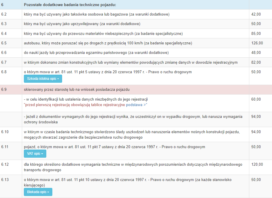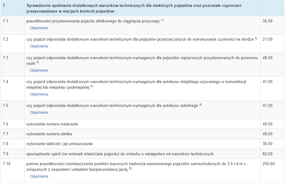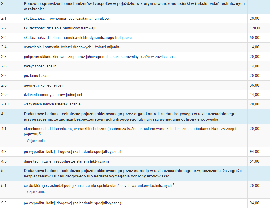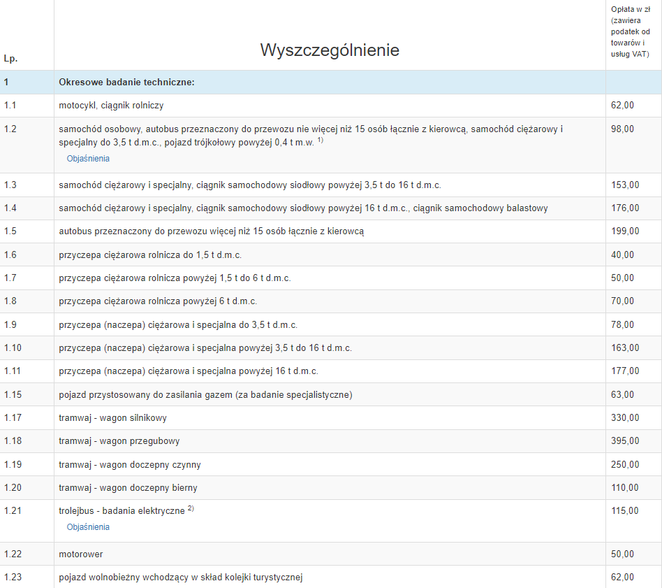 TABELA OPŁAT ZA BADANIA TECHNICZNE POJAZDÓW - CENNIK